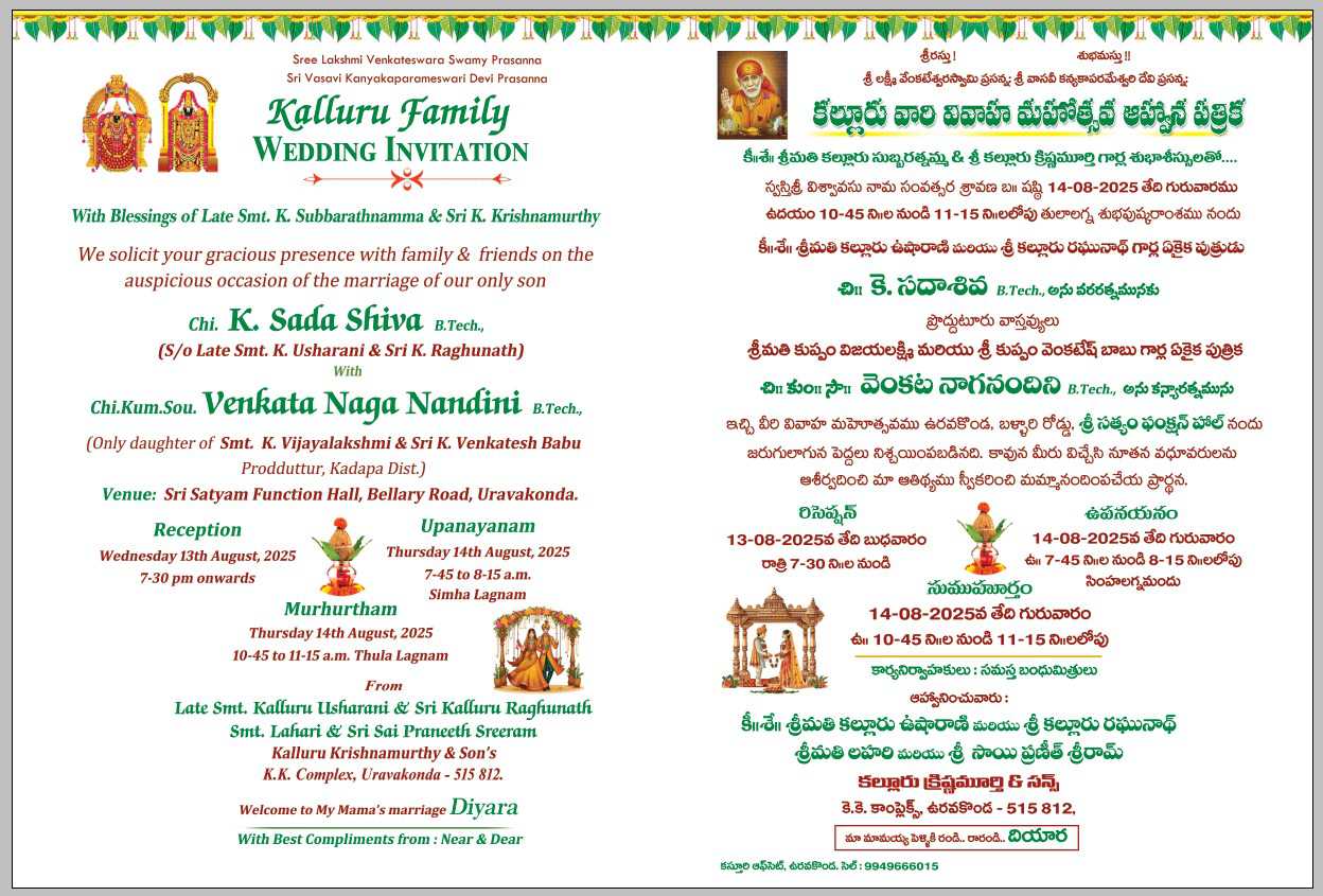 Reception - 7.30 PM IST Onwards, Sri Satyam Function Hall, Uravakonda.